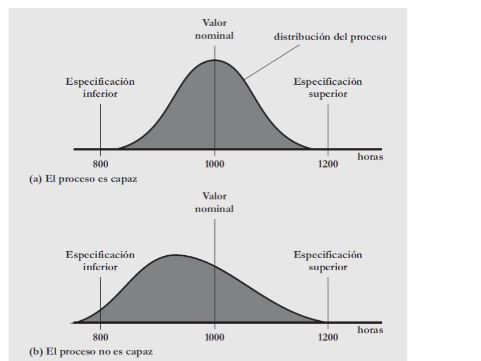 La capacidad de un proceso se define como la capacidad de un proceso de cumplir las especificaciones de un producto o servicio. Típicamente las especificaciones de diseño se expresan como un valor nominal y la tolerancia o margen de aceptación, es decir un límite superior de especificación y un límite inferior de especificación.Si un proceso está en control estadístico la característica de la calidad del 99,73% de los elementos fabricados estará comprendida entre µ-3σ y µ+3σ